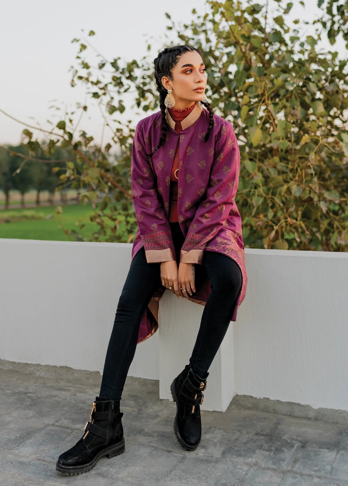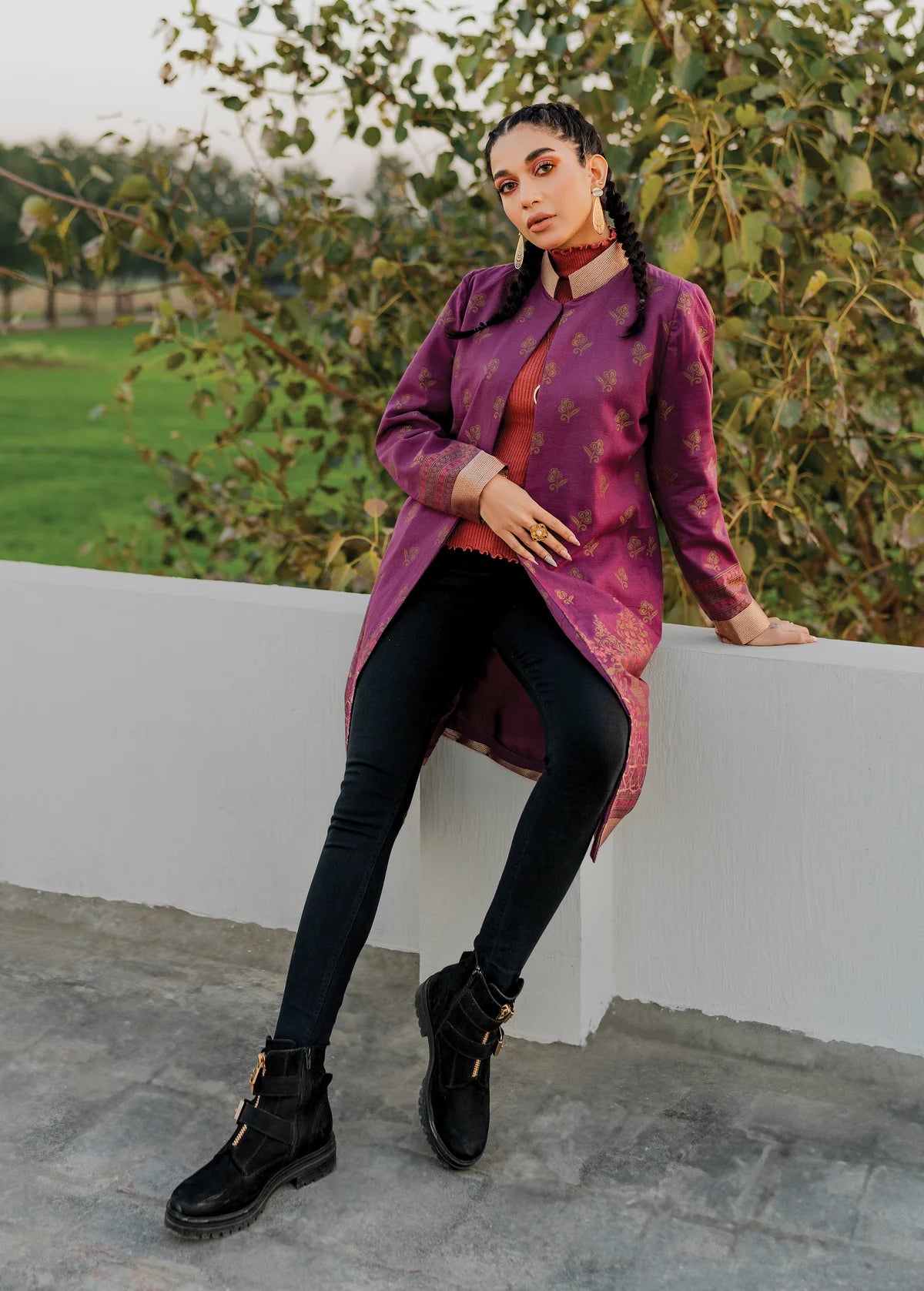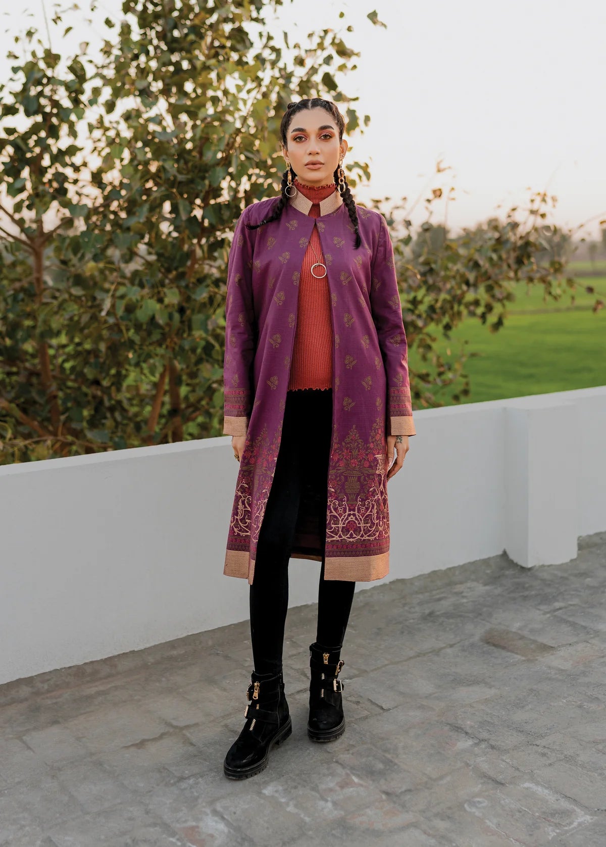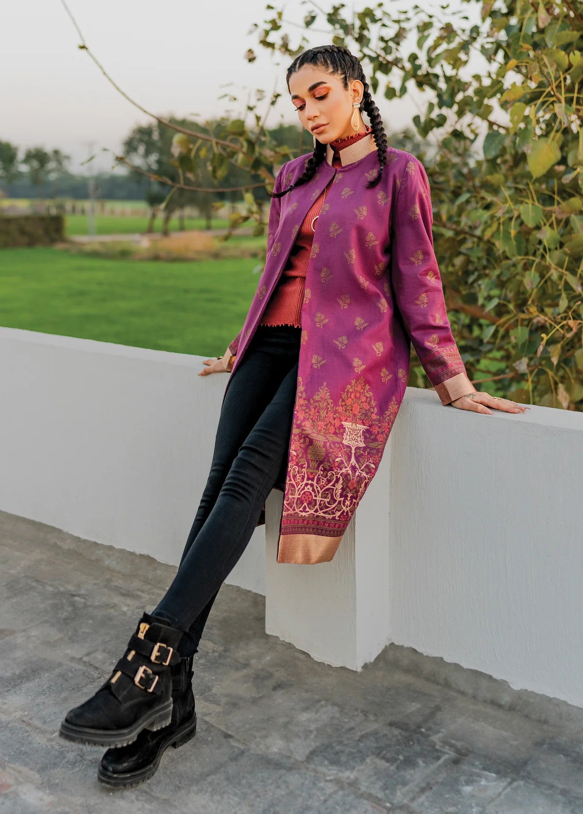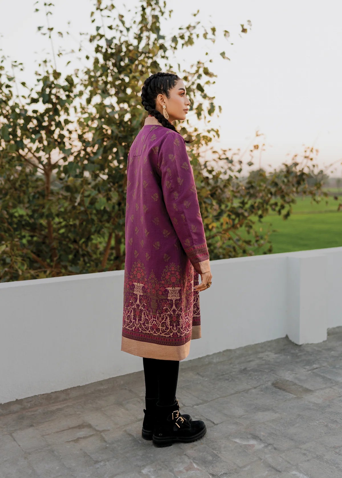 Description: Embrace opulence with our stunning purple slub khaddar jacquard jacket adorned in the harmonious blend of pink and gold accents against the regal purple backdrop, creating an ensemble that captivates attention with its radiant allure.