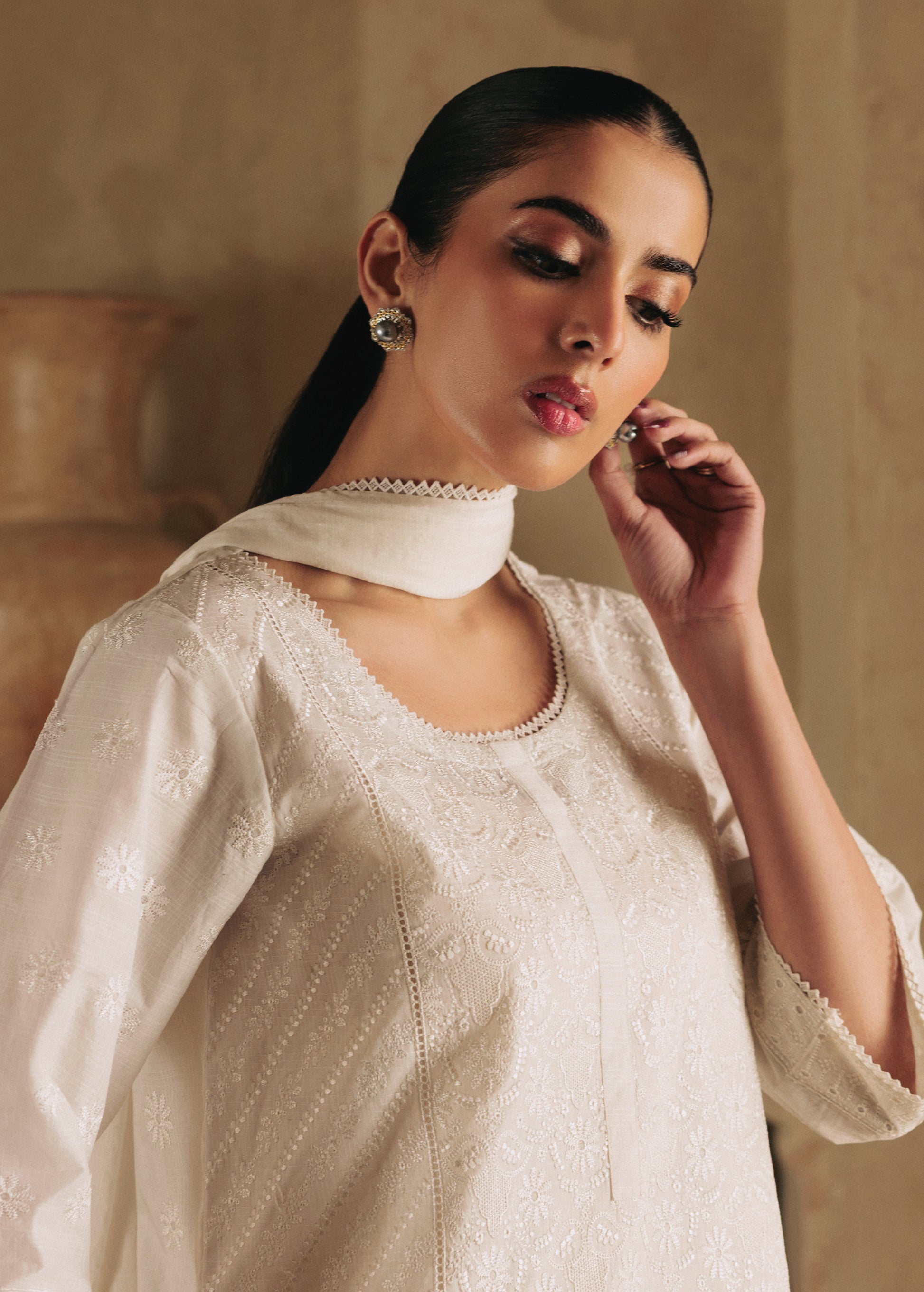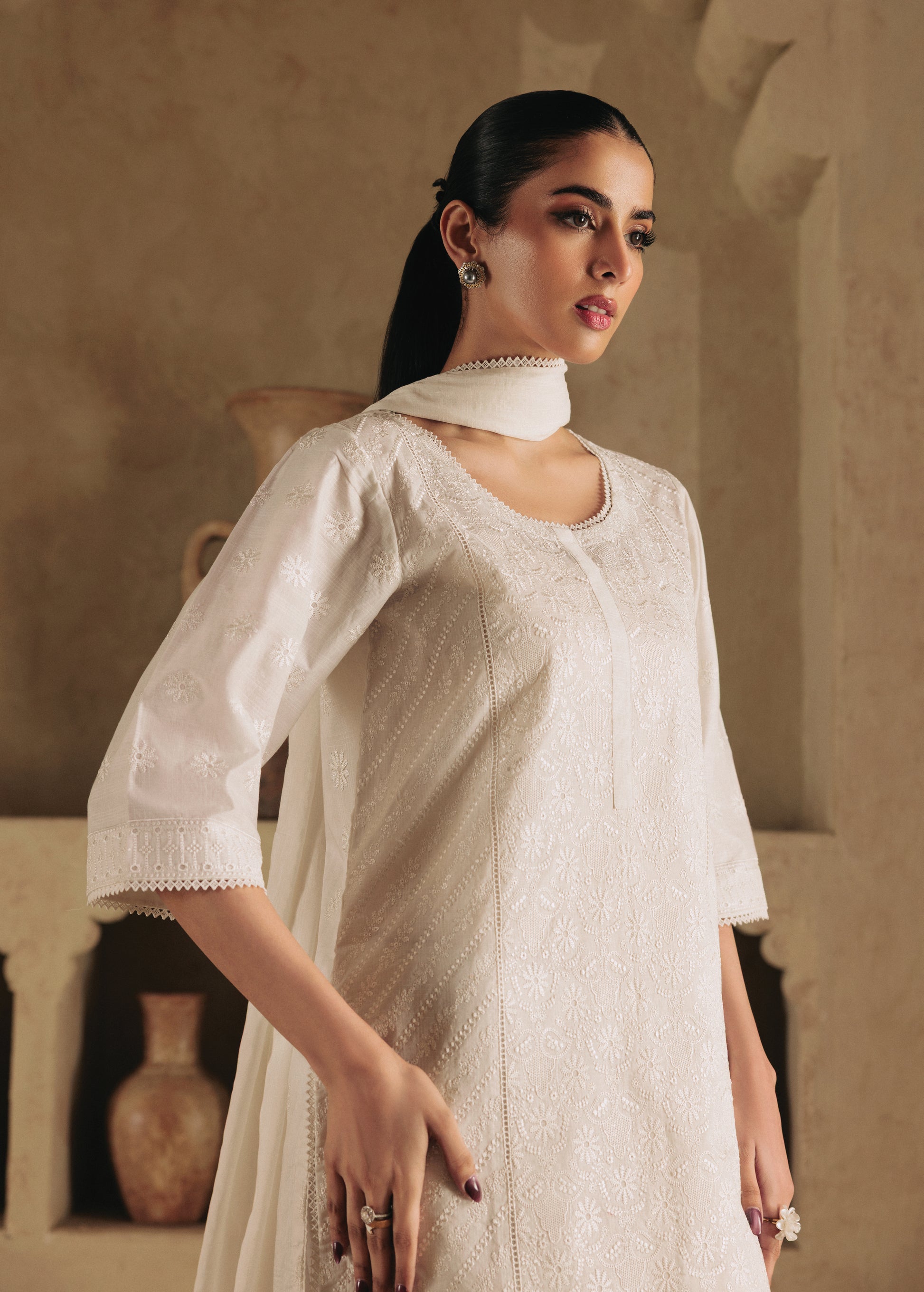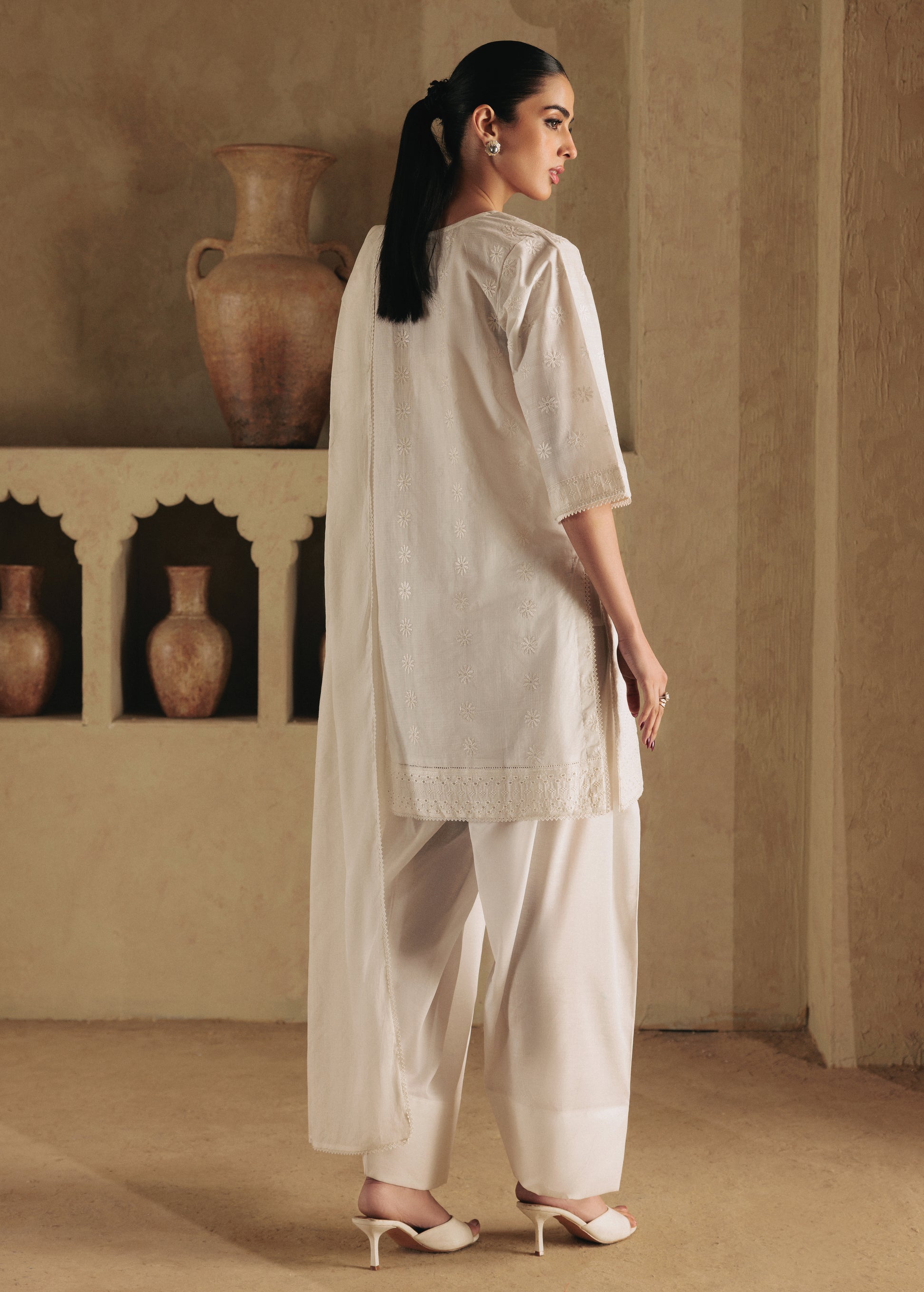 Safa is a pure white 2-piece ensemble crafted in delicately embroidered schiffli,